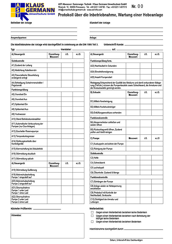 AST Germann, Pirmasens, Formular „Wartung einer Hebeanlage” Formular, 3-fach, 3-farbig, selbstdurchschreibend, mit fortlaufender Nummerung und verschiedenfarbenen Kopien Das Formular wurde von 6 DIN-A4-Seiten auf eine Seite übertragen bzw. angepasst. Format: A4 mit Trennleiste oben, 210 x 297/312 mm
