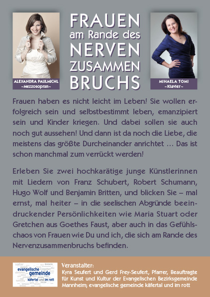 ![]() | Frauen am Rande des NervenzusammenbruchsPlakat und Flyer zum Konzert am 25. Oktober 2015 in der Philippuskirche in Mannheim mit Liedern von Schubert, Schumann, Wolf und Britten. Format: DIN-A 2 |